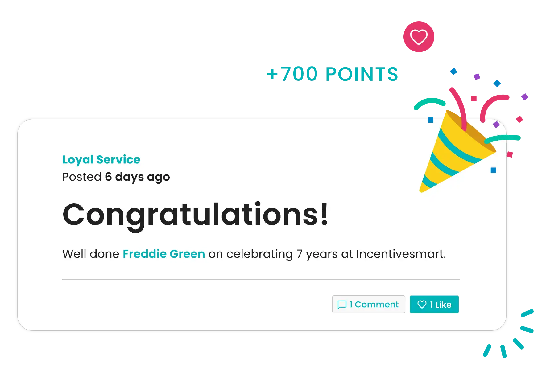 Celebrate length of service milestones with congratulations and reward points.